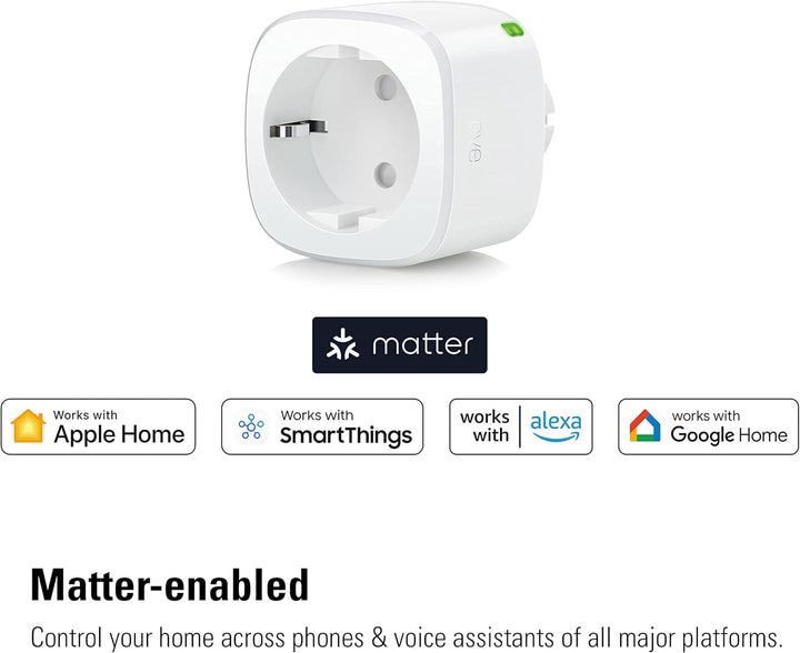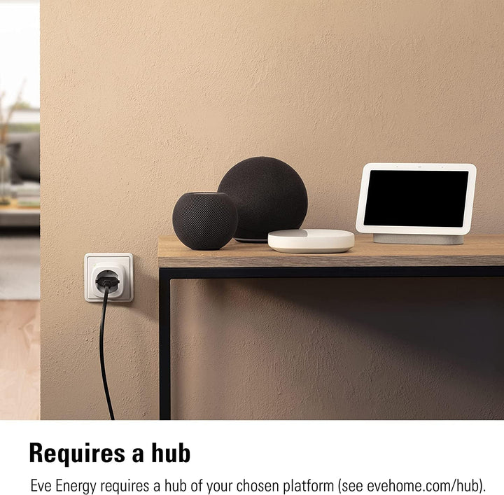 - Produkt 2: Eve Energy erfordert iOS/iPadOS 16.4 (oder neuer) oder Android 8.1 (oder neuer) sowie eine Steuerzentrale der von Ihnen gewählten Plattform: Apple: Apple TV 4K (2. Gen.), Apple TV 4K (3. Gen. 128 GB), HomePod (2. Gen.), HomePod mini /