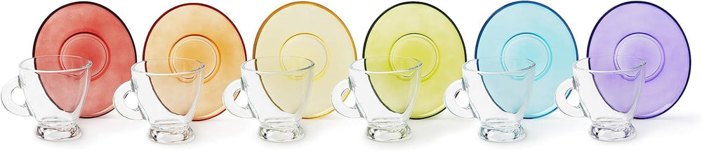 • Transparente Tassen und jede Untertasse in einer anderen Farbe: Rot, Orange, Gelb, Grün, Hellblau und Lila