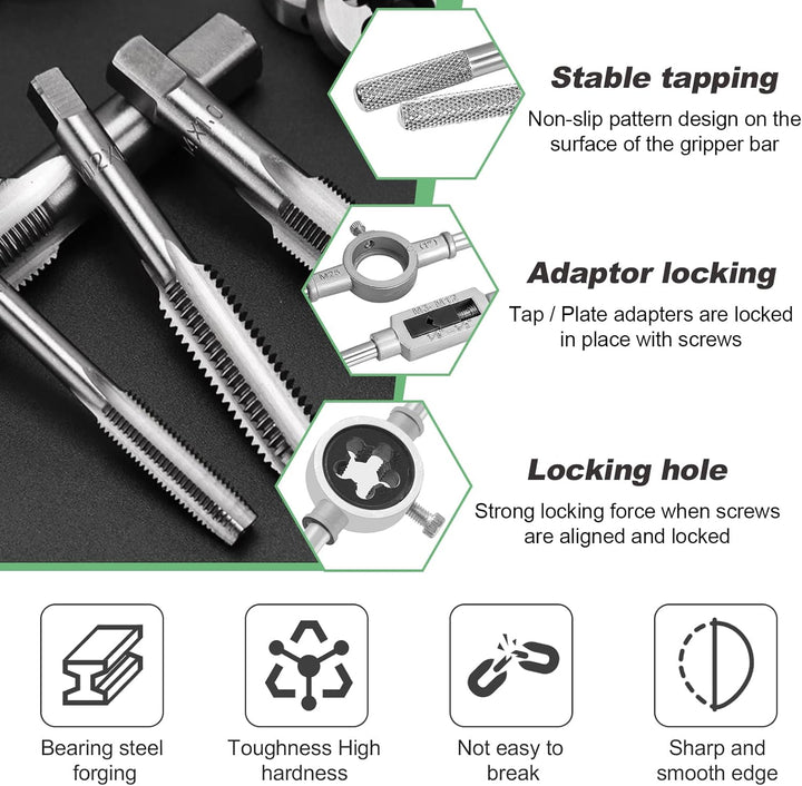 - đ ăEinfache Lagerung und TragbarkeităïŒMachen Sie sich keine Sorgen mehr, Ihre Werkzeuge zu verlieren oder zu verlegen! Unser metrisches Gewindebohrer- und Schneideisen-Set ist in einem gut gestalteten, robusten Aufbewahrungskoffer mit Schlitzen