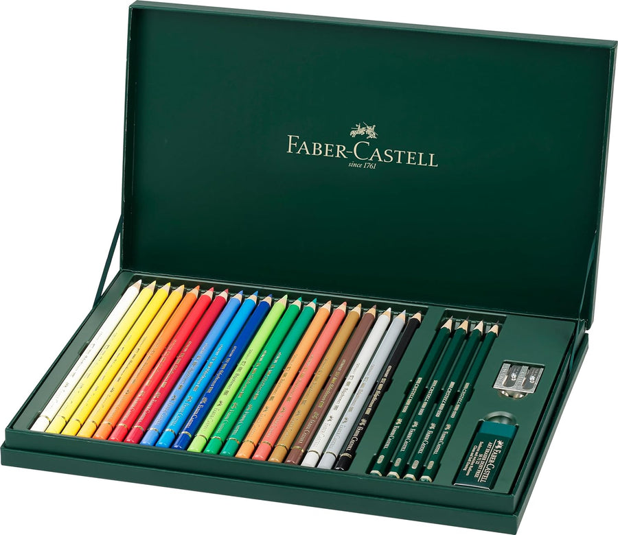- Inhalt: 20 Polychromos Farbstifte, 4 Künstlerbleistifte Castell 9000 (2H, HB, 2B, 8B), ein Radierer und ein Metalldoppelspitzer