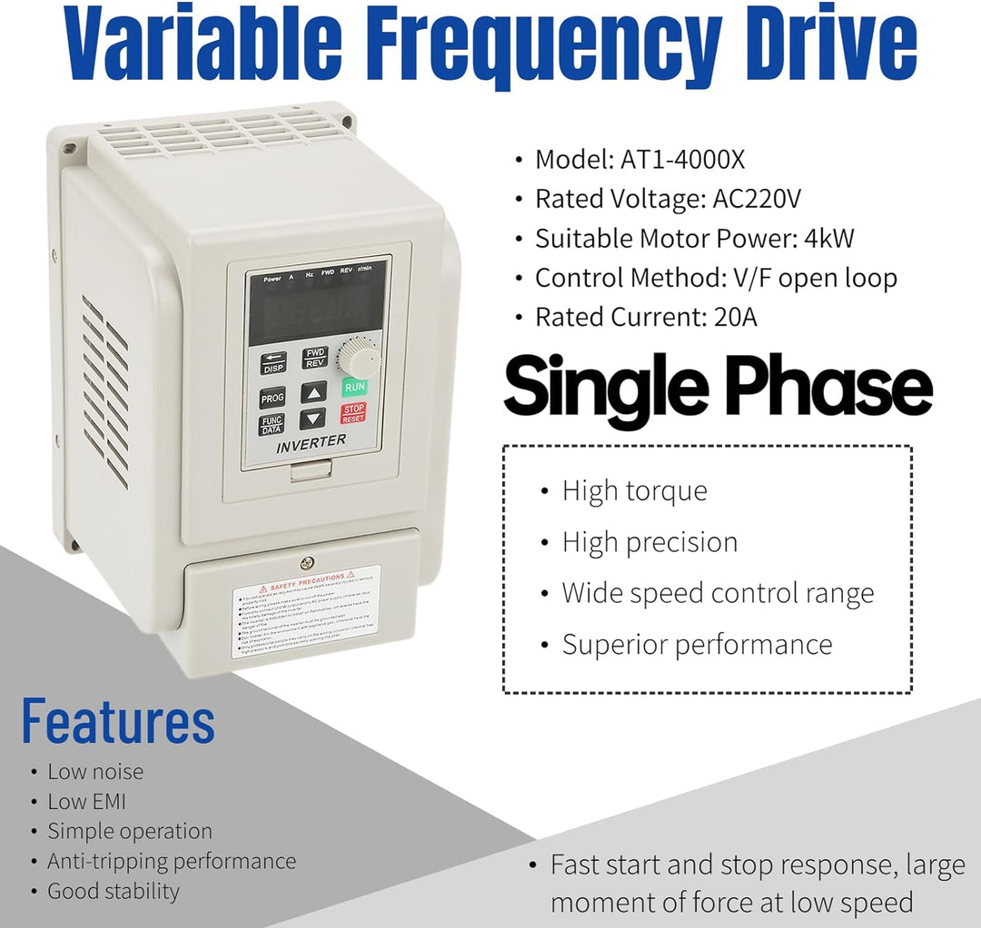 - Modell: AT1-4000X; Nennspannung: AC220V (einphasig); Geeignete Motorleistung: 4 kW; Steuermethode: V/F Open Loop; Einstellbare Ausgangsspannung Methode: PWM Forts.