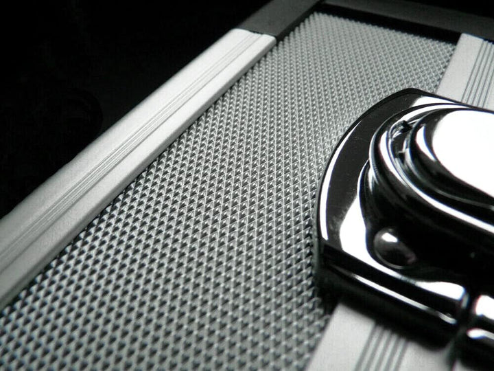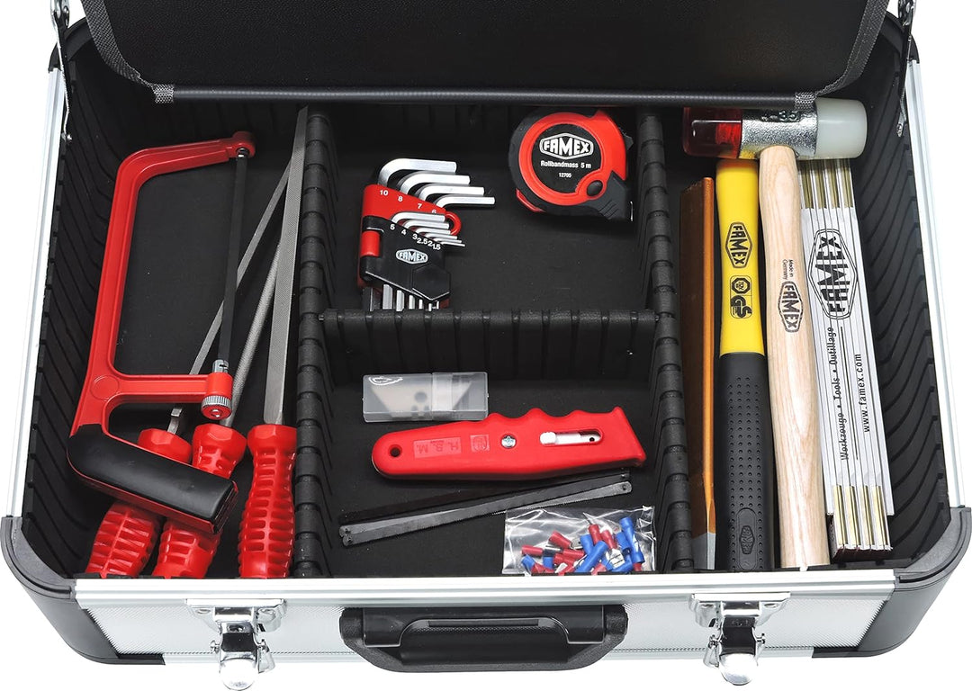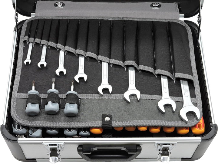 - DER ROBUSTE ALU-WERKZEUGKOFFER - Der Werkzeugkoffer hat Aussenflächen und Profile aus Aluminium (kein alugefärbter Kunststoff. Er beinhaltet 2 Paletten mit 56 Einstecktaschen, erlaubt die variable Anordnung des Werkzeugs, passend zu Ihren individuellen