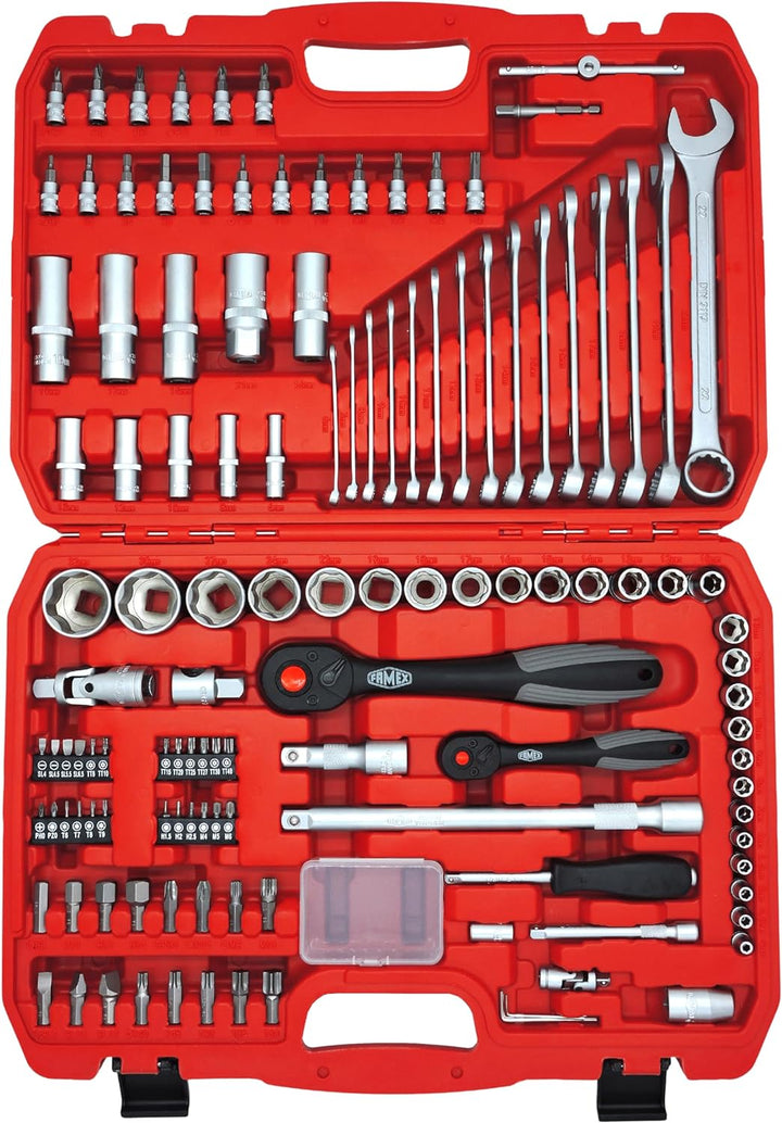 - DER STECKSCHLÜSSELSATZ - Das Set enthält zudem einen 125-teiligem Steckschlüsselsatz 4-32mm, Knarren in Composite-Konstruktion (Chrom-Vanadium-Stahl-kunststoffummantelt) mit 72 Zähnen und Verriegelungsmechanik, Steckschlüsseleinsätze 4-32 mm und