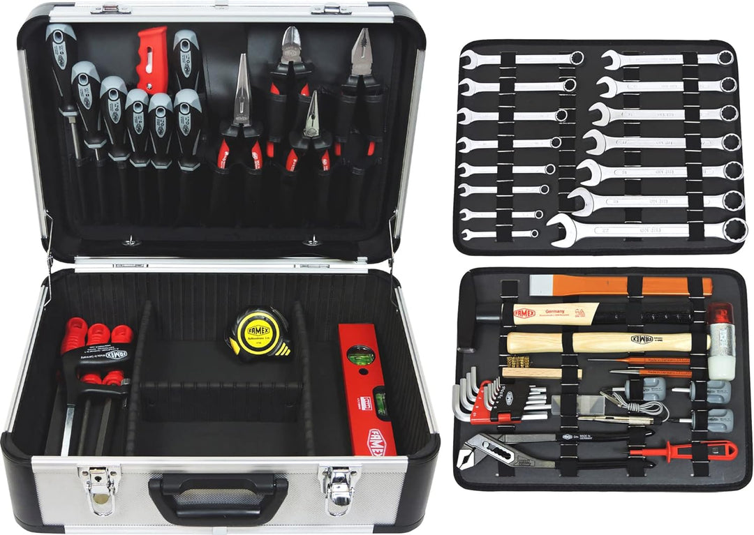 - DER WERKZEUGKOFFER - Attraktiver und besonders hochwertiger Werkzeugkoffer. Speziell verstärkte Deckel- Boden und Seitenflächen, Aussenflächen aus Aluminium. Mit einer herausnehmbaren Universal-Werkzeugpalette und einer Werkzeugpalette mit
