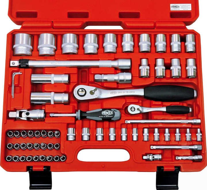 - DER STECKSCHLÜSSELSATZ - mit 66-tlg. Steckschlüsselsatz FAMEX 580-16, mit 2 Super-Feinzahnknarren mit 108 Zähnen, Einsätzen mit Wellenprofil und Rändelung, Verlängerung mit Verriegelungsmechanik, 4 Verlängerungen mit 2-Stufen-Schwenksystem