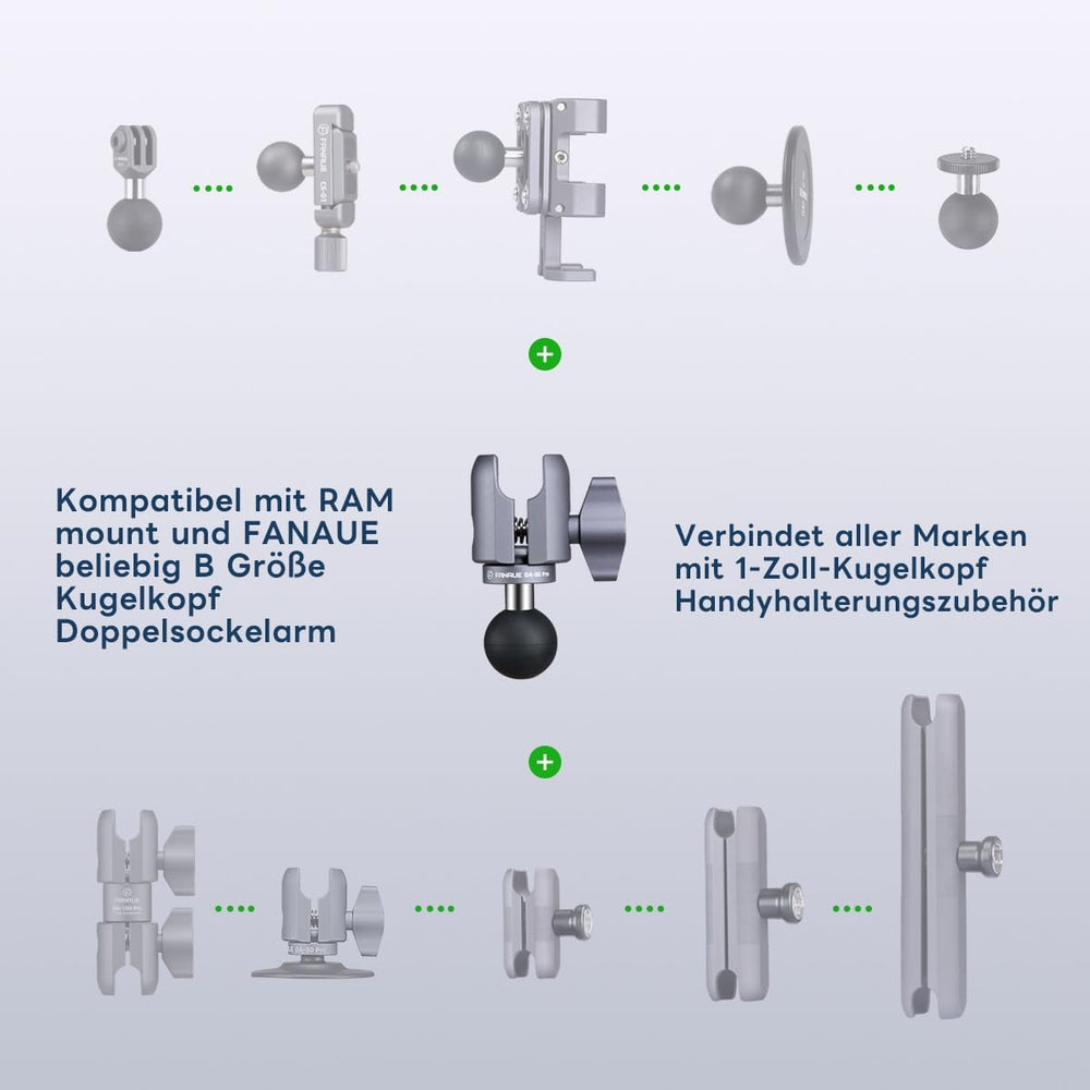 - đăEinfach zu installierenăVerbindungsarm mit 1 Zoll Kugeladapter ist ein gutes Kugelhalterungszubehör fĂŒr Erweiterung des Handyhalters, Kugelkopfteil verbindet sich mit dem B Grösse Doppelsockelarm, Kugelhalterungsclip verbindet sich mit jedem