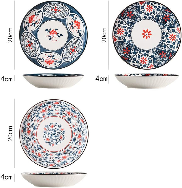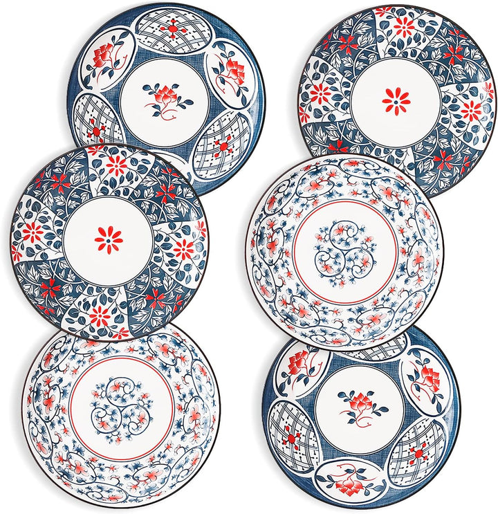 fanquare 6-er Teller-Set Porzellan Japanischer Stil, Blaue Blätter und Rote Blumen Flache Desserttel