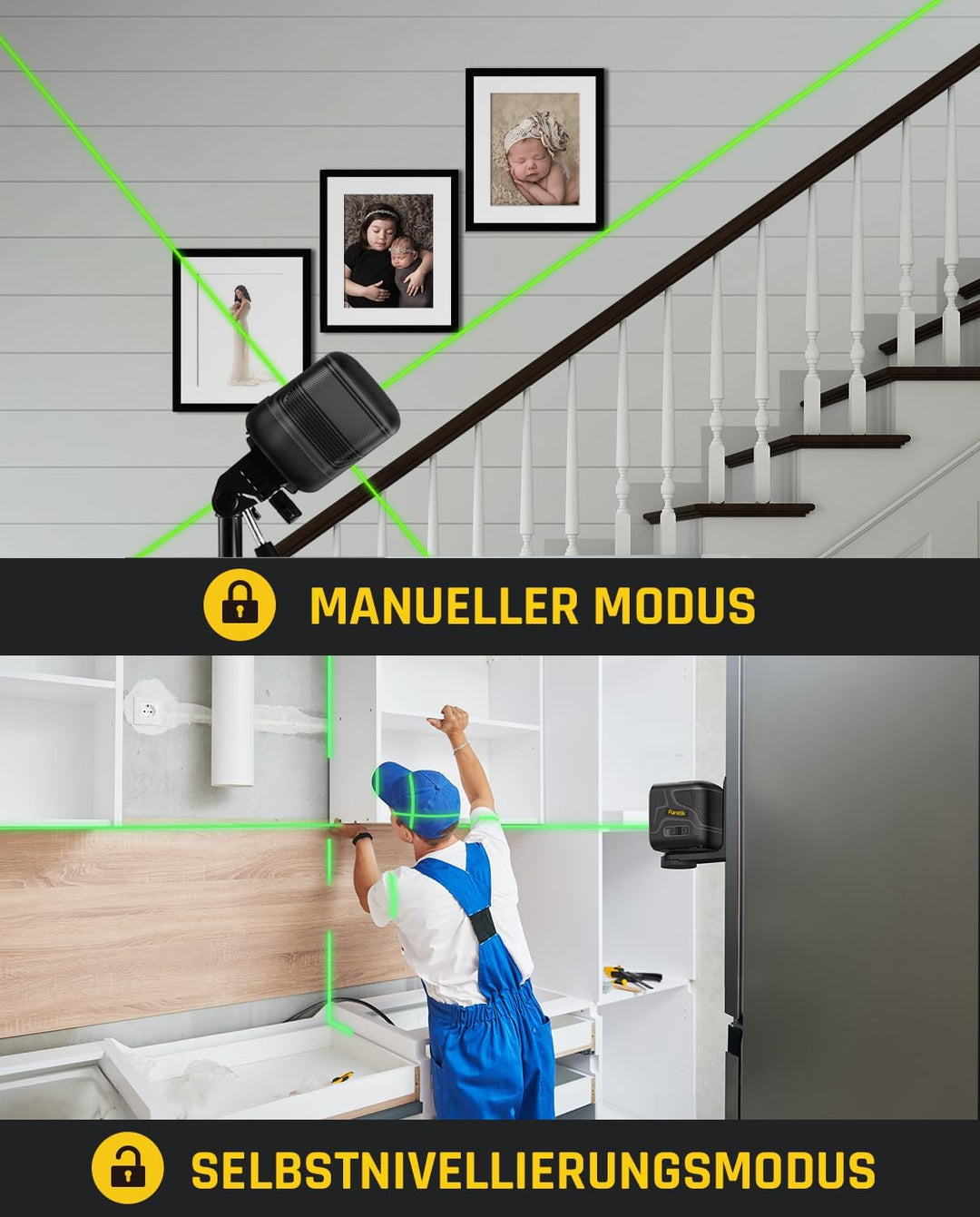 - Selbstnivellierend & Manueller Modus: Bei entriegeltem Pendel sind die Laser für die Selbstnivellierung ausgelegt. Wenn der Kreuzlinienlaser so stark geneigt wurde, dass er sich nicht selbst nivellieren kann (> 4°), blinkt der Laserstrahl alle 0,5 s.
