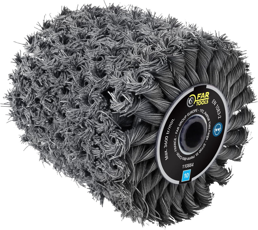 - Drahtbürste aus Metall, verdrillt – besonders starkes Abbeizen auf flachen Oberflächen Stein und Metall (Durchmesser 120 mm). Breite: 100 mm