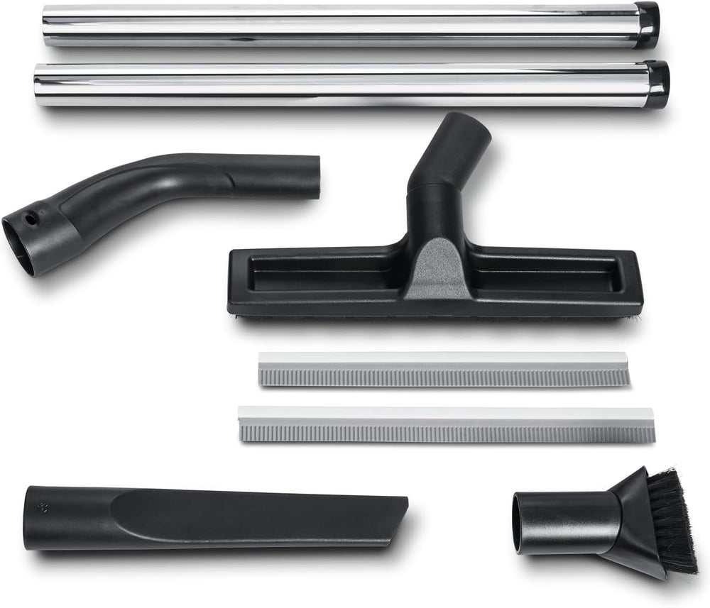 - 1 Saugschlauch 4 m, 1 Werkzeugmuffe, 1 Vliesfiltersack, 1 Flachfaltenfilter Zellulose, 2 Saugrohre (Metall-Ausführung), 1 Kombidüse mit Wechseleinsätzen, 1 Fugendüse, 1 Saugpinsel, 1 Krümmer