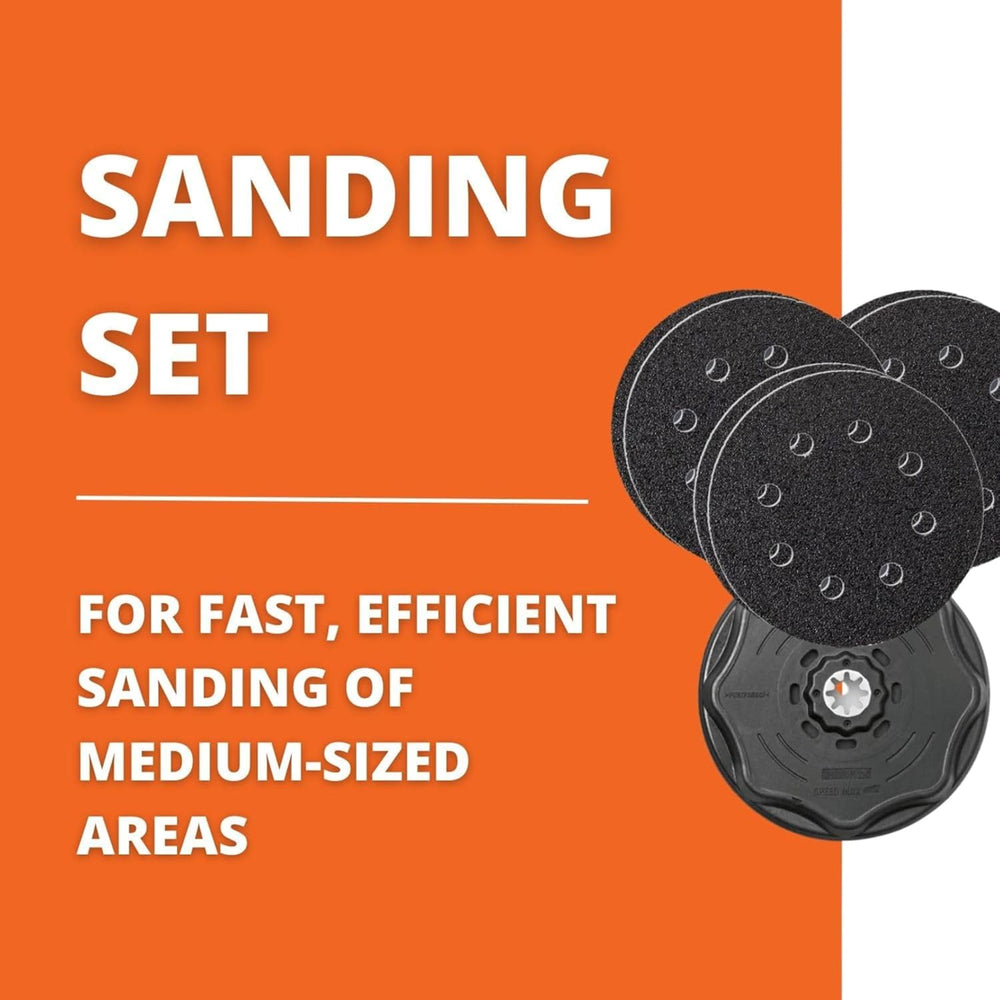 - Lieferumfang: 1 Schleifteller Ø 115 mm, je 2 gelochte Schleifblätter Korn 60, 80, 180.