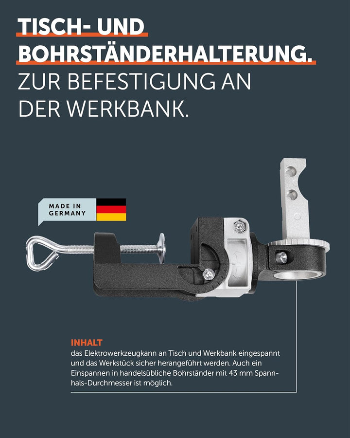 - Auch ein Einspannen in handelsübliche Bohrständer mit 43 mm Spannhals-Durchmesser ist möglich