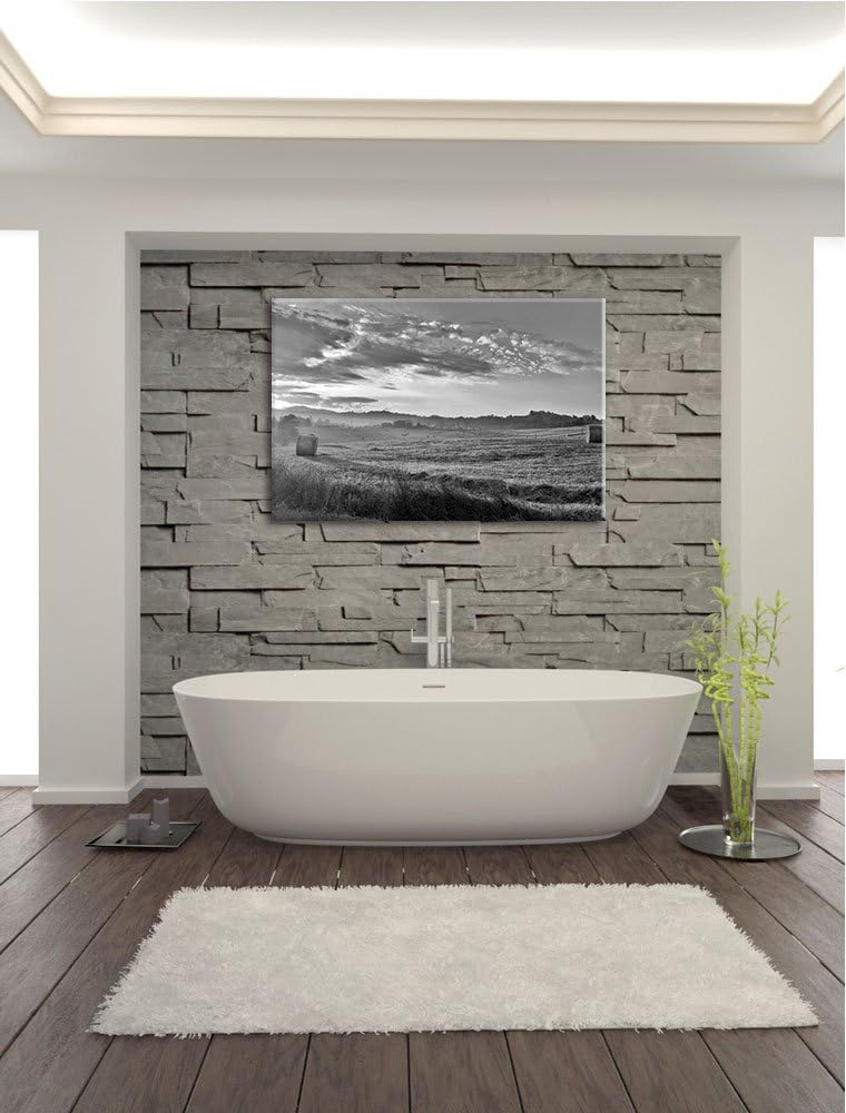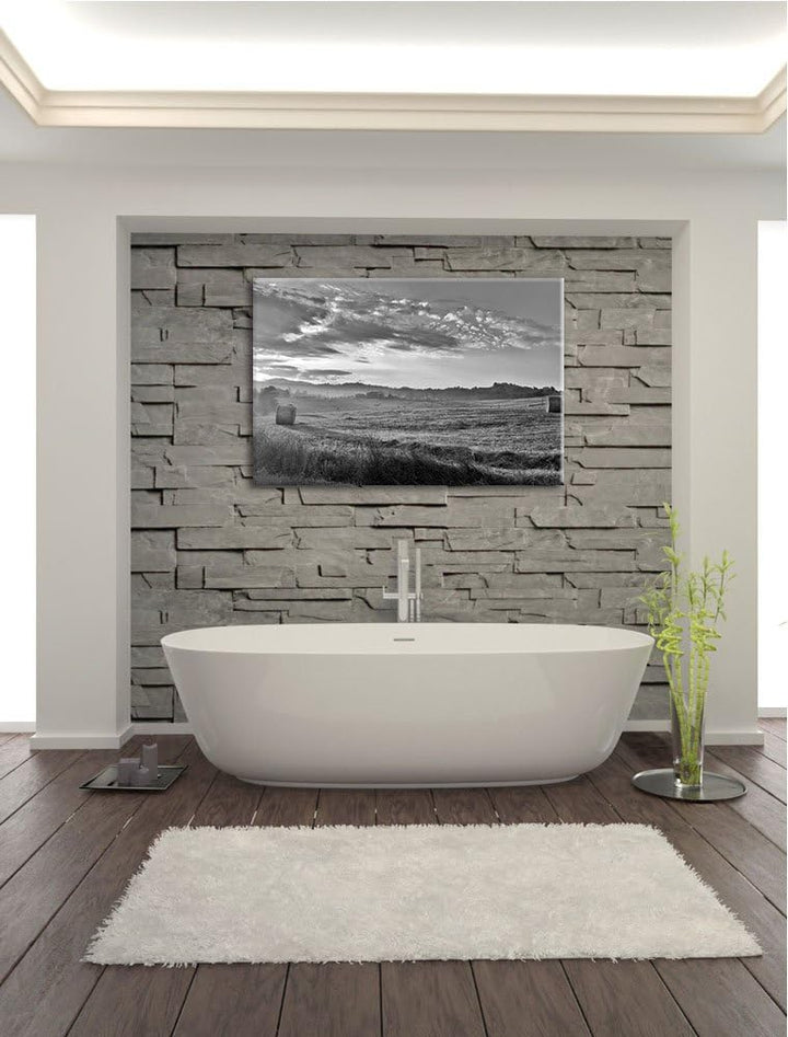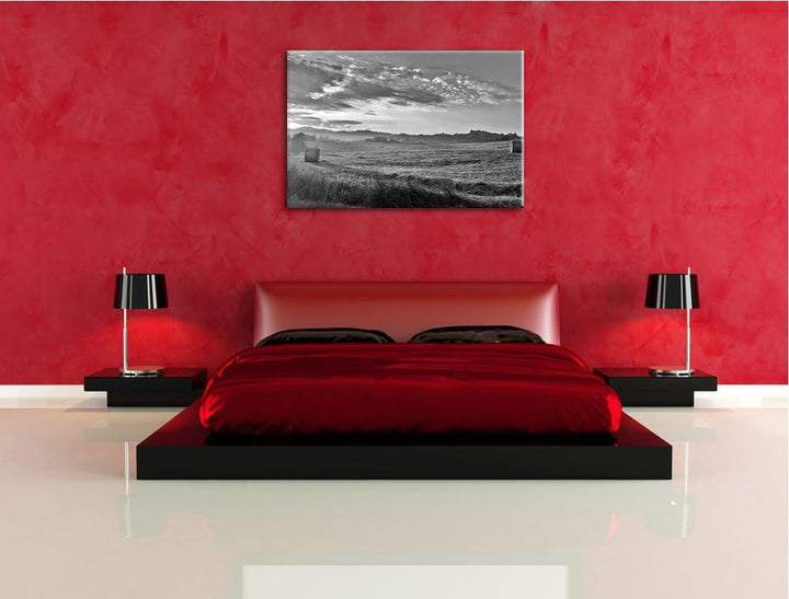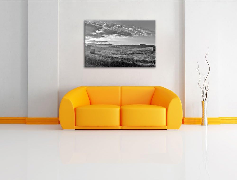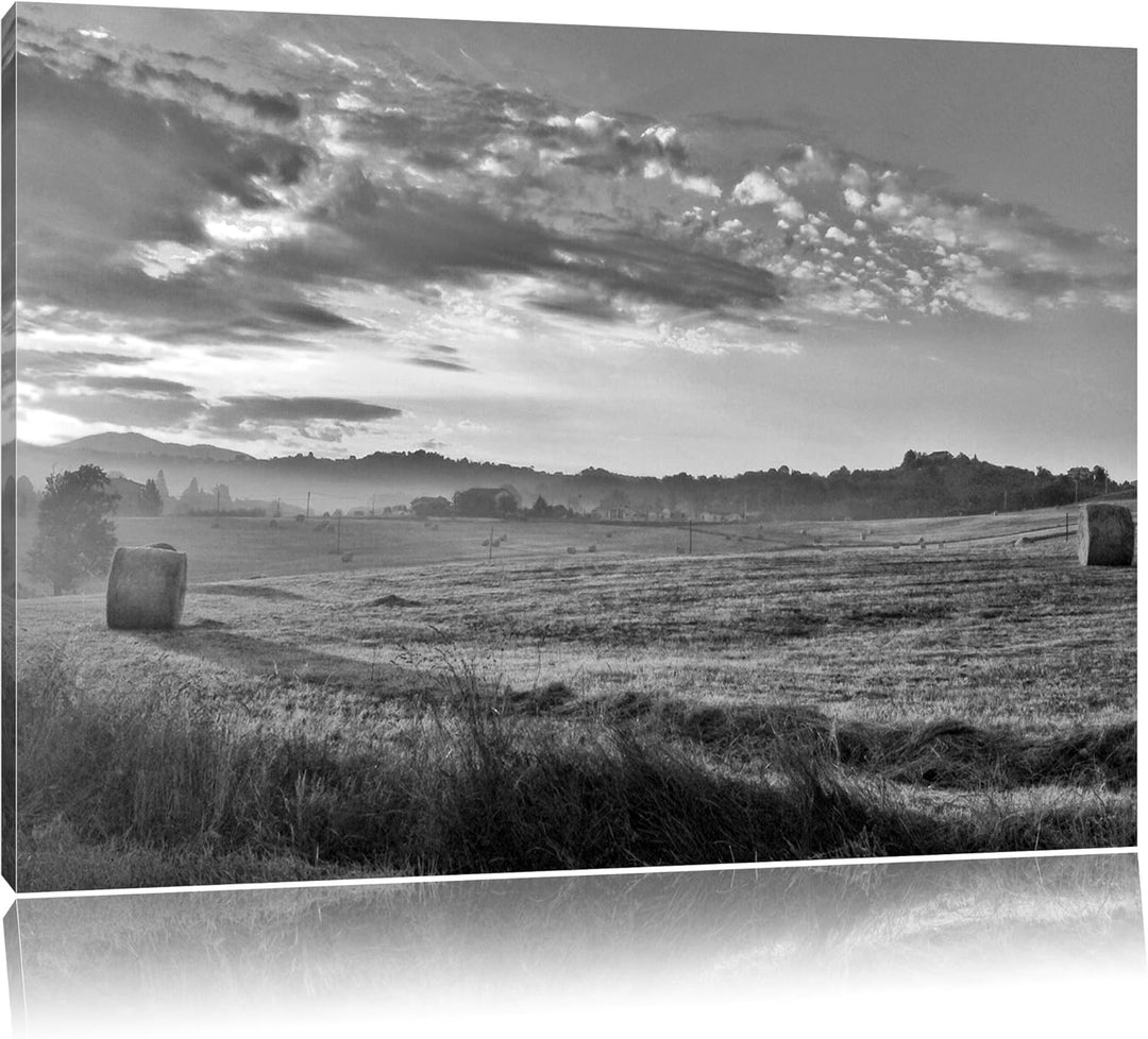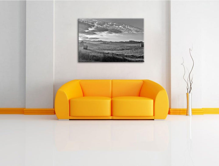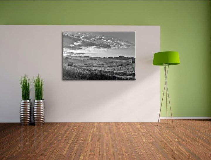 Feld mit Heuballen schwarz/weiss Format: 100x70 auf Leinwand, XXL riesige Bilder fertig gerahmt mit