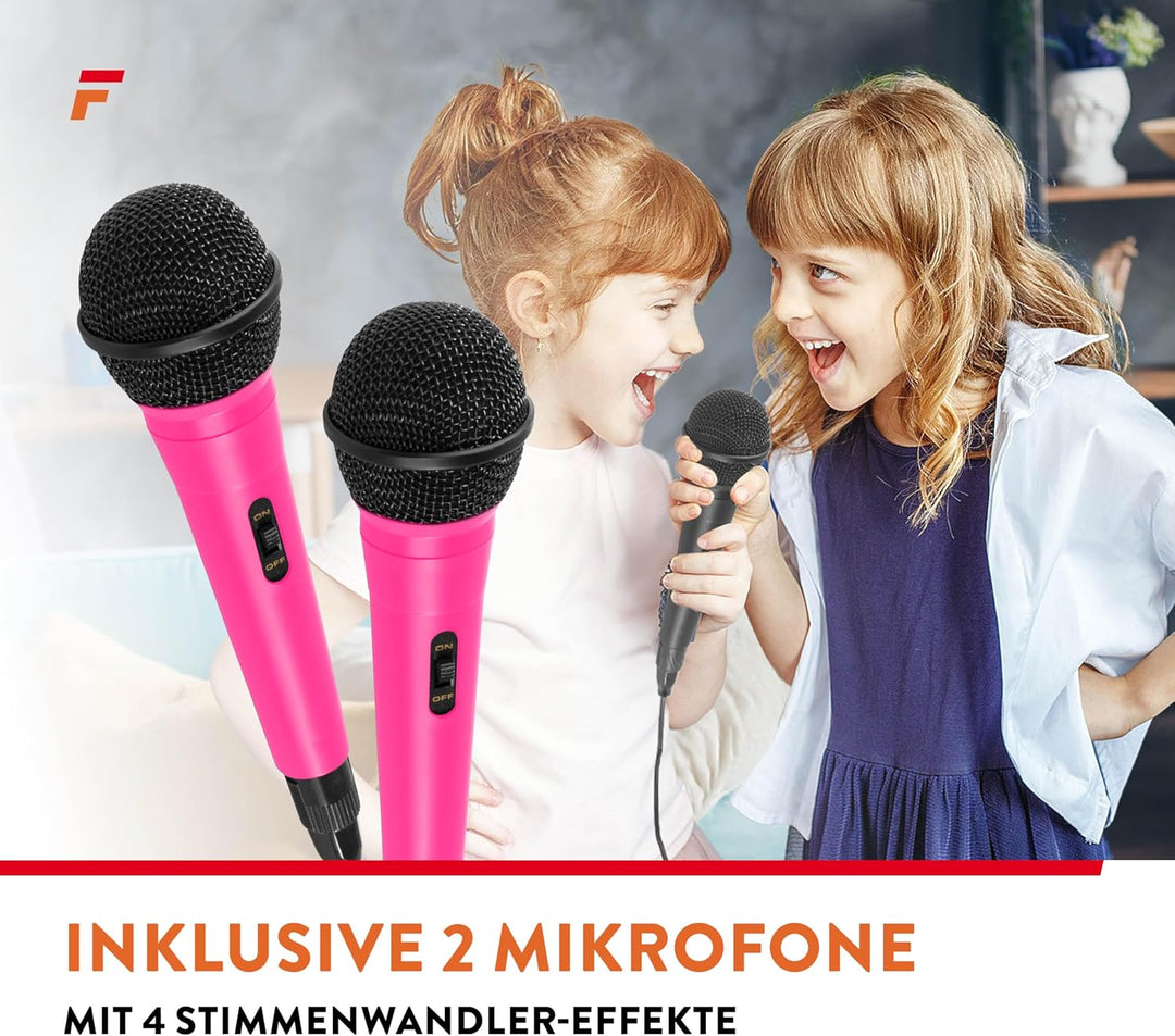 - Karaoke Anlage mit 2 Mikrofonen : 2x Karaoke Mikrofon für grossartige Duette und vier Echo-Modi für einen professionellen Karaoke-Sound. Mini Karaoke Mädchen Maschine in knalligem Pink !