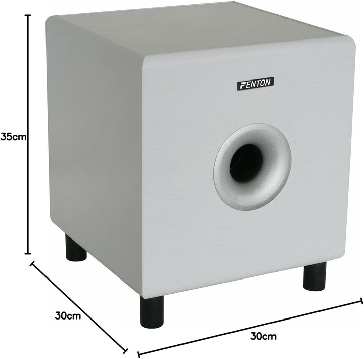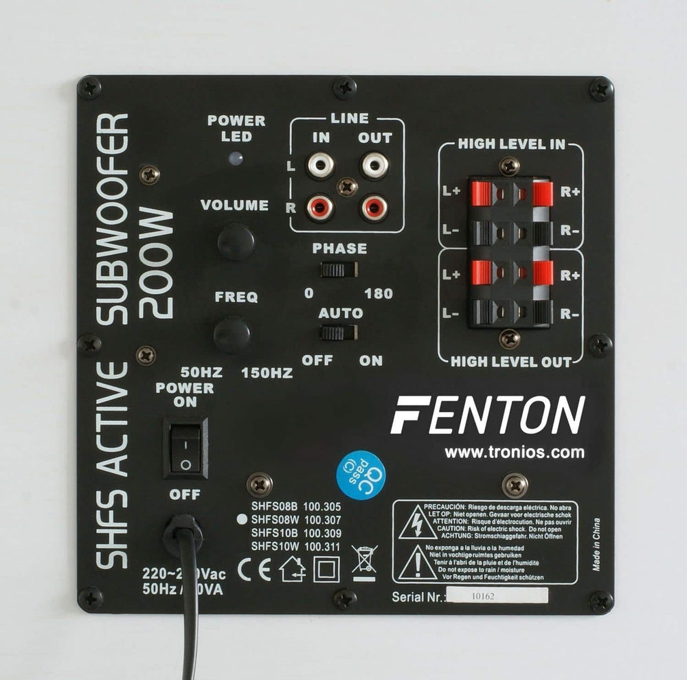 - Der SHFS08W ist ein aktiver Subwoofer, das heisst, er hat einen eingebauten Verstärker. Dieser 200-Watt-Verstärker treibt den 10-Zoll-Tieftöner für eine perfekte und tiefe Basswiedergabe an.
