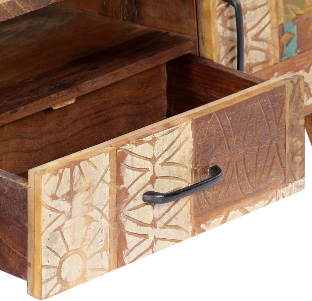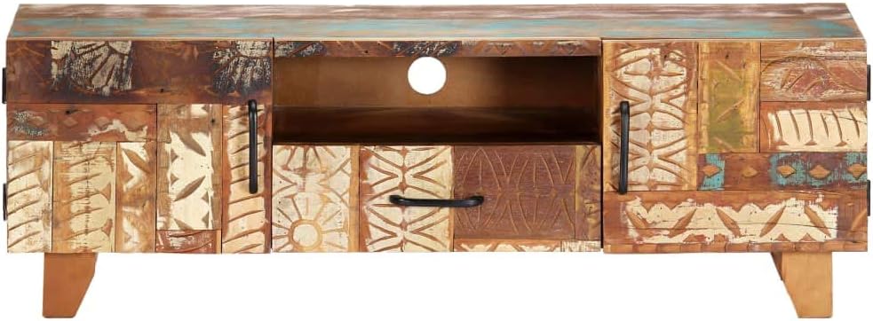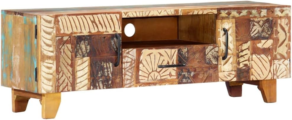 - Der farbenfrohe HiFi-Schrank mit handgeschnitztem Muster in Antik-Stil besteht aus massivem Altholz, das aus Balken, Fussböden und Stützbalken von alten abgerissenen Gebäuden stammt. Verschiedene Holzarten wie Sheesham (Palisander), Kiefer, Teak,