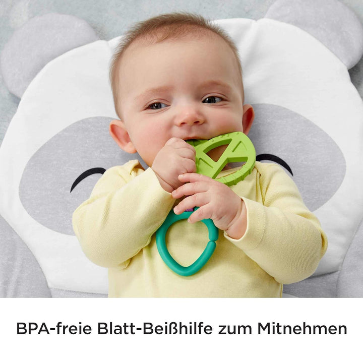 - Vier Beschäftigungsmöglichkeiten für das Baby: ein knisterndes Spielzeug für unterwegs, eine BPA-freie Blatt-Beisshilfe, eine abnehmbare Babyrassel in der Form eines Peace-Zeichens und der Pandaschwanz, der Klingelgeräusche macht