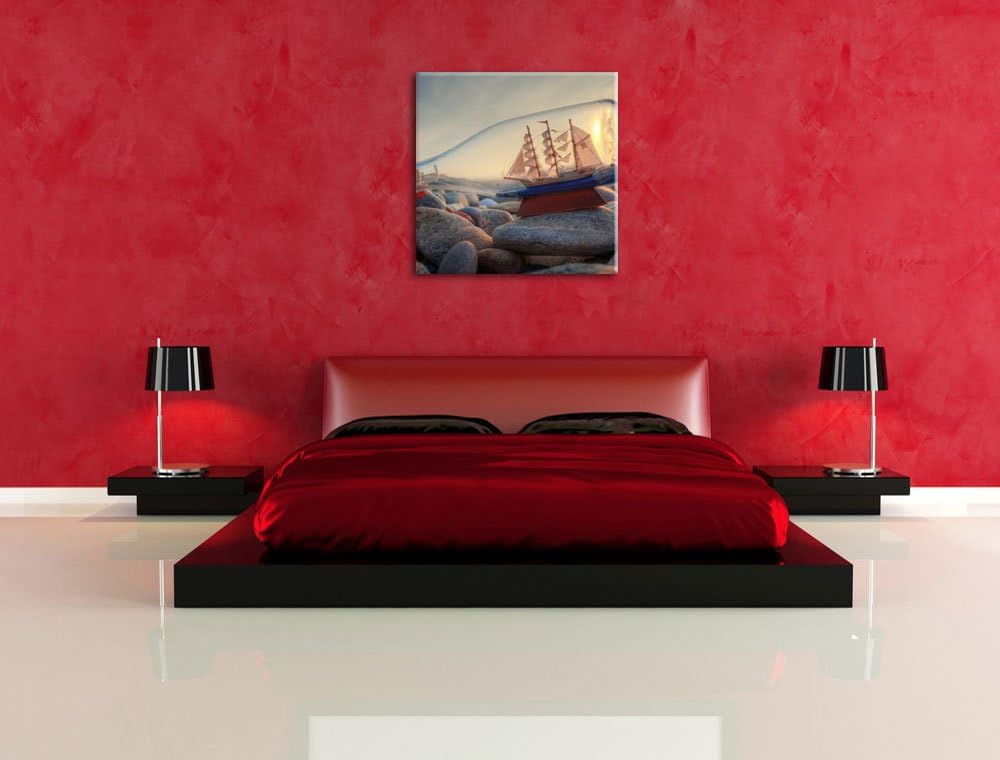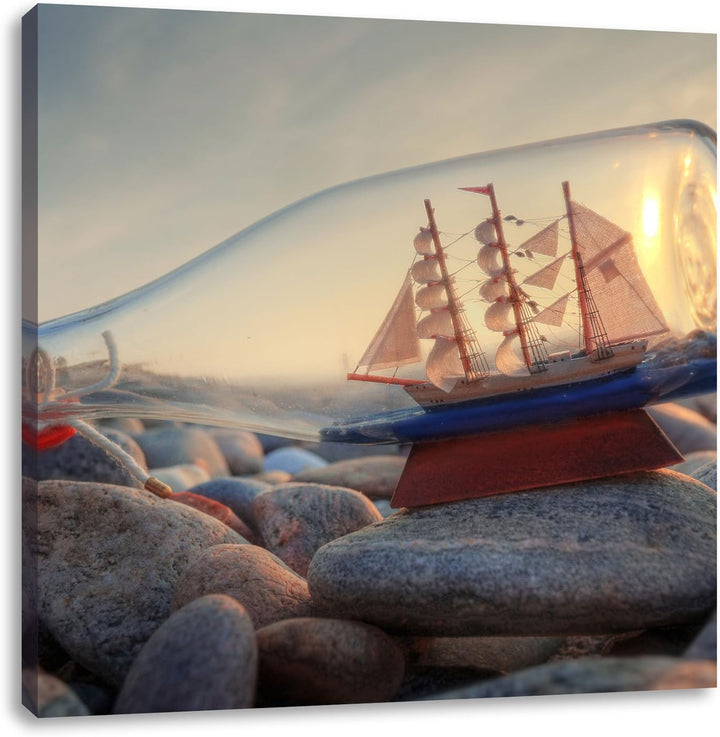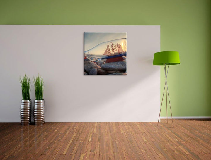Flasche mit Schiff, Format: 70x70 auf Leinwand, XXL riesige Bilder fertig gerahmt mit Keilrahmen, Ku
