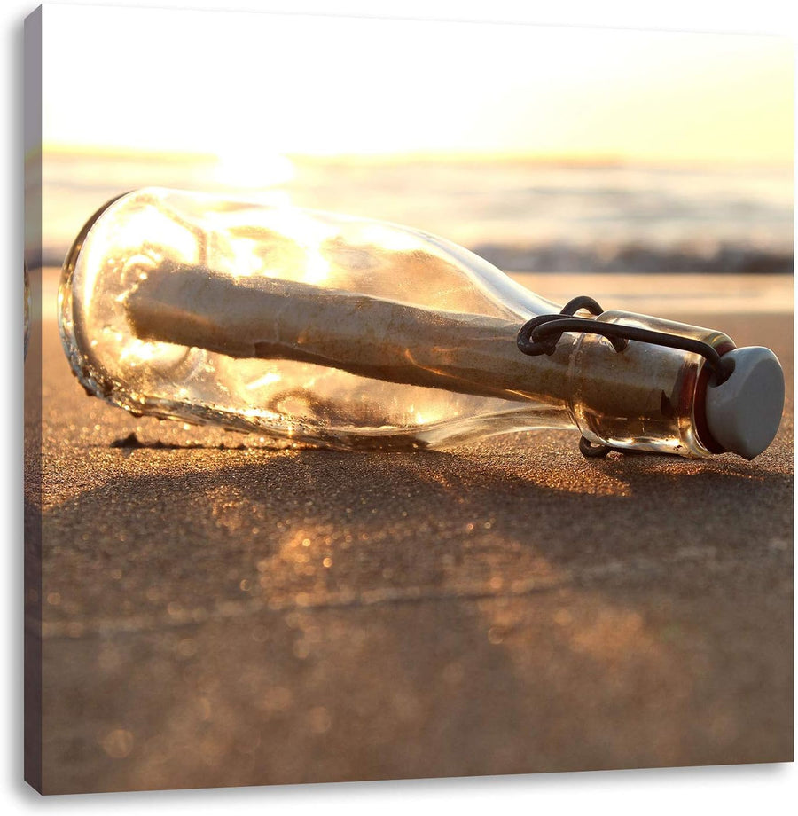 Flaschenpost am Strand, Format: 70x70 auf Leinwand, XXL riesige Bilder fertig gerahmt mit Keilrahmen