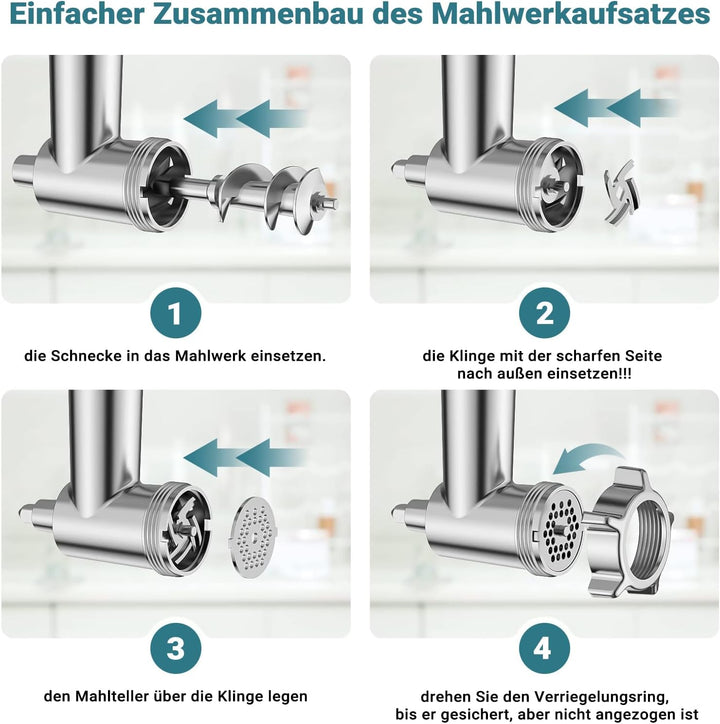 - 🍎【Hinweis zur Reinigung】 Zur optimalen Reinigung und Pflege empfehlen wir, diese fleischwolf edelstahl zubehör für kitchenaid von Hand zu waschen. Dadurch wird sichergestellt, dass die Fleischwolf aufsatz für KitchenAid fleischwolf in bestem