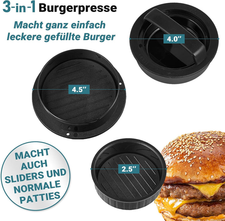 - 🍎【3-in-1-Antihaft-Burger-Patty-Maker】 Mit dem 3-in-1-Antihaft-Burger-Patty-Maker lassen sich mühelos Mini-Burger bis hin zu extra grossen Burger-Patties herstellen. Er besteht aus hochwertigem Antihaft-Material, das ein sauberes Herauslösen