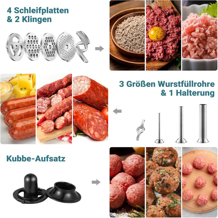 - 🍎【Vielseitig und erschwinglich】 (1) Das fleischwolf Zubehör über 3 Grössen von Wurstfüllrohren und einen zusätzlichen Füllring, mit dem Sie ganz einfach eine Vielzahl von Frühstückswürsten herstellen können. (2) Das mitgelieferte
