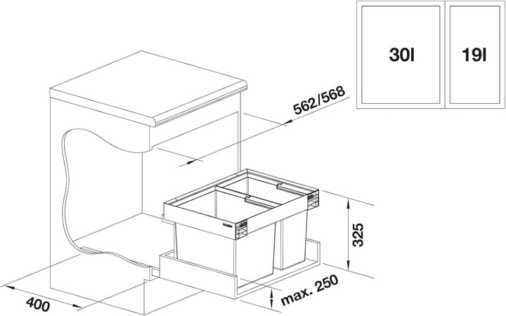 - Für Unterschränke mit geteilten Schubladen und einer Breite von 50 und 60 cm (dank reduzierter Einbauhöhe von 330 mm)