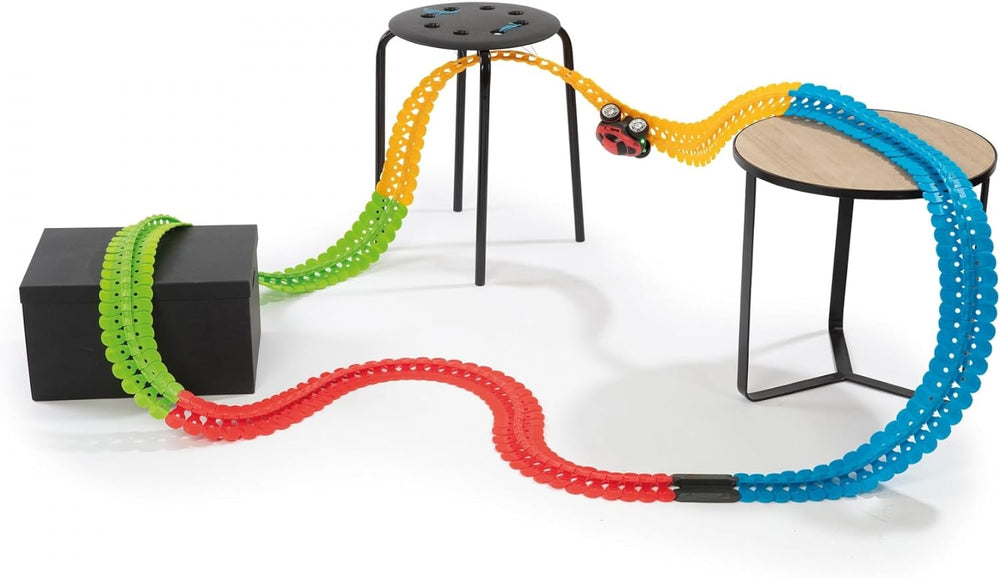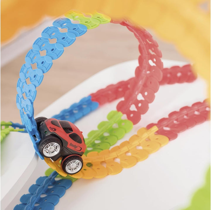 • Grosser Lieferumfang – 184 bunte Schienen-Elemente für bis zu 4,40 m lange Rennstrecke, leistungsstarkes Rennauto mit Front- und Rückscheinwerfer, Austausch-Karosserie, Start-/Endschiene