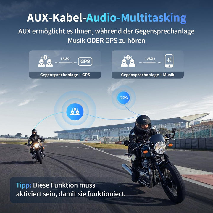 - Musik zwischen 2 M1-S Plus Motorrad Headsets teilen: M1-S Plus Motorradhelm Bluetooth Headsets, die miteinander gekoppelt sind, können Sie die gleiche Musik mit anderen Fahrern oder Beifahrern hören. Bitte beachten Sie jedoch, dass die Musikfreigabe