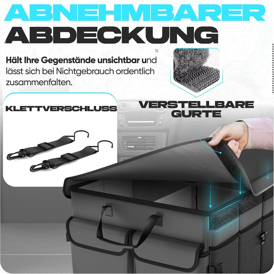 - · Zusammenklappbare Autotasche Kofferraumtasche mit abnehmbarem Deckel - Sie können die Kofferraumtasche auch als Rücksitz- oder Beifahrersitz Organizer verwenden sowie ihn in der Mitte Ihres Fahrzeugs platzieren, da sie auf 1 Fach zusammenklappbar