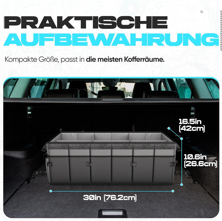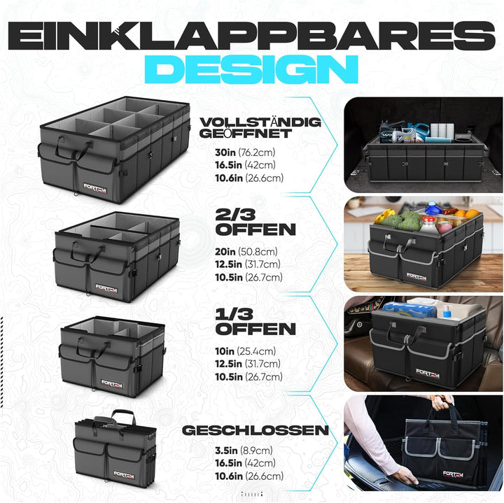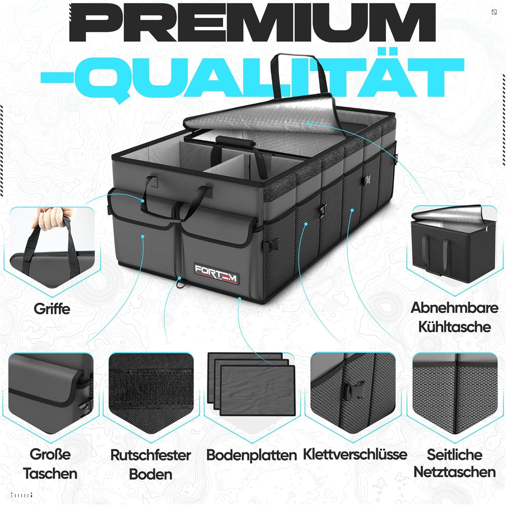 - · Robustes Boxendesign - Der Premium Auto Kofferraum Organizer von Fortem ist mit stabilen Bodenplatten verstärkt, sodass jede Seitenwand gestützt wird. Unsere Kofferraum Tasche ist die beste unter den Auto Organizer Lösungen und Aufbewahrungsboxen