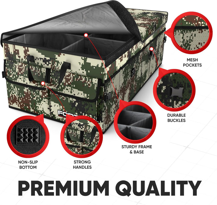 - Robustes Boxendesign - Der Premium Auto Kofferraum Organizer von Fortem ist mit stabilen Bodenplatten verstärkt, sodass jede Seitenwand gestützt wird. Unsere Kofferraum Tasche ist die beste unter den Auto Organizer Lösungen und Aufbewahrungsboxen mit