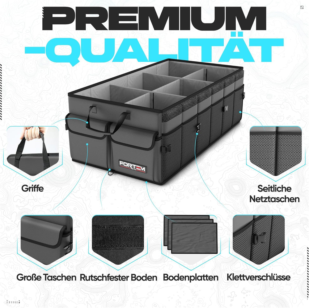 • Robustes Boxendesign - Der Premium Auto Kofferraum Organizer von Fortem ist mit stabilen Bodenplatten verstärkt, sodass jede Seitenwand gestützt wird. Unsere Kofferraum Tasche ist die beste unter den Auto Organizer Lösungen und Aufbewahrungsboxen mit