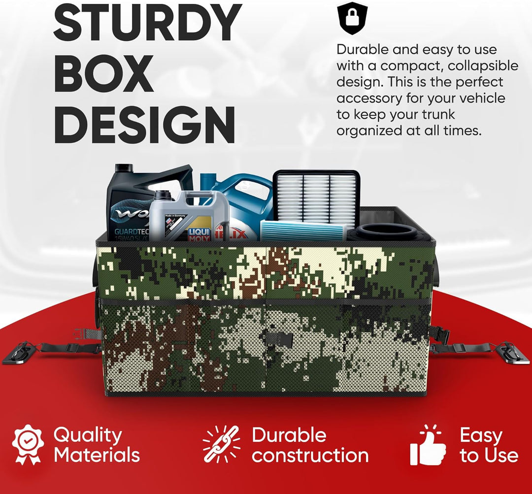 - · Bleibt fest an Ort und Stelle - Unsere Organizer Kofferraum Box hat rutschfeste Streifen, um ein Verrutschen zu verhindern, sowie verstellbare Gurte mit Metallhaken zur Befestigung in Ihrem Kofferraum. Verstauen Sie kleine Gegenstände in den