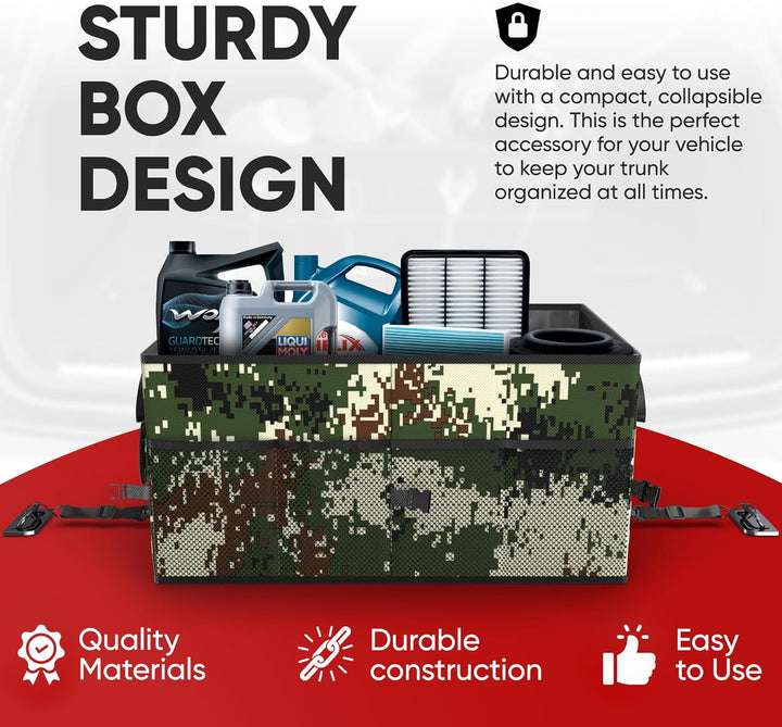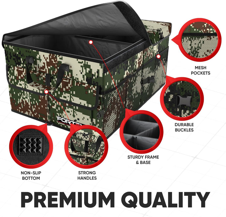 - · Robustes Boxendesign - Der Premium Auto Kofferraum Organizer von Fortem ist mit stabilen Bodenplatten verstärkt, sodass jede Seitenwand gestützt wird. Unsere Kofferraum Tasche ist die beste unter den Auto Organizer Lösungen und Aufbewahrungsboxen