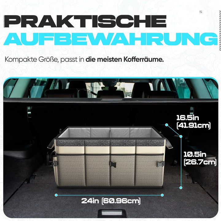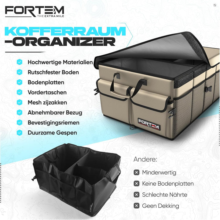 - · Robustes Boxendesign - Der Premium Auto Kofferraum Organizer von Fortem ist mit stabilen Bodenplatten verstärkt, sodass jede Seitenwand gestützt wird. Unsere Kofferraum Tasche ist die beste unter den Auto Organizer Lösungen und