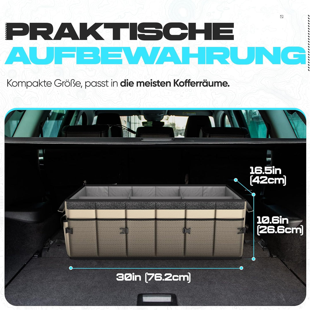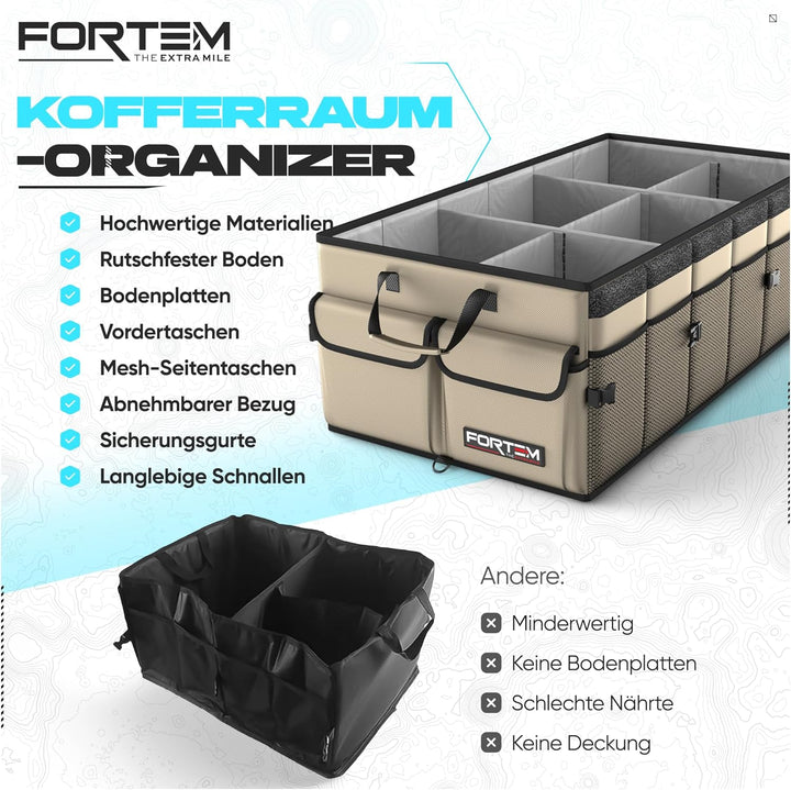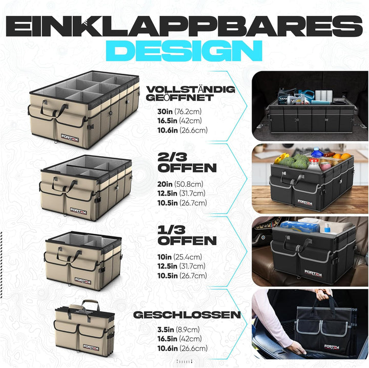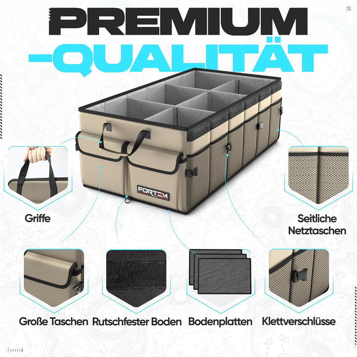 • ·       Robustes Boxendesign - Der Premium Auto Kofferraum Organizer von Fortem ist mit stabilen Bodenplatten verstärkt, sodass jede Seitenwand gestützt wird. Unsere Kofferraum Tasche ist die beste unter den Auto Organizer Lösungen und