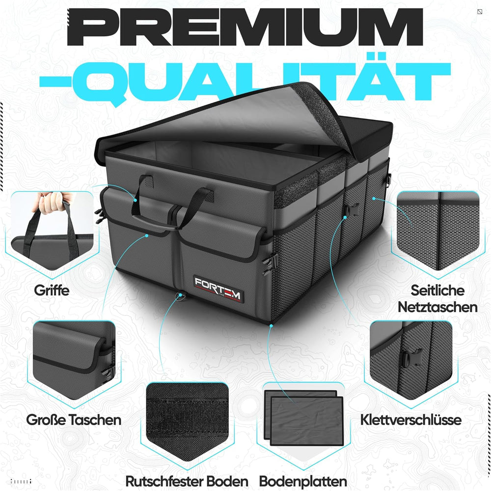 - · Robustes Boxendesign - Der Premium Auto Kofferraum Organizer von Fortem ist mit stabilen Bodenplatten verstärkt, sodass jede Seitenwand gestützt wird. Unsere Kofferraum Tasche ist die beste unter den Auto Organizer Lösungen und