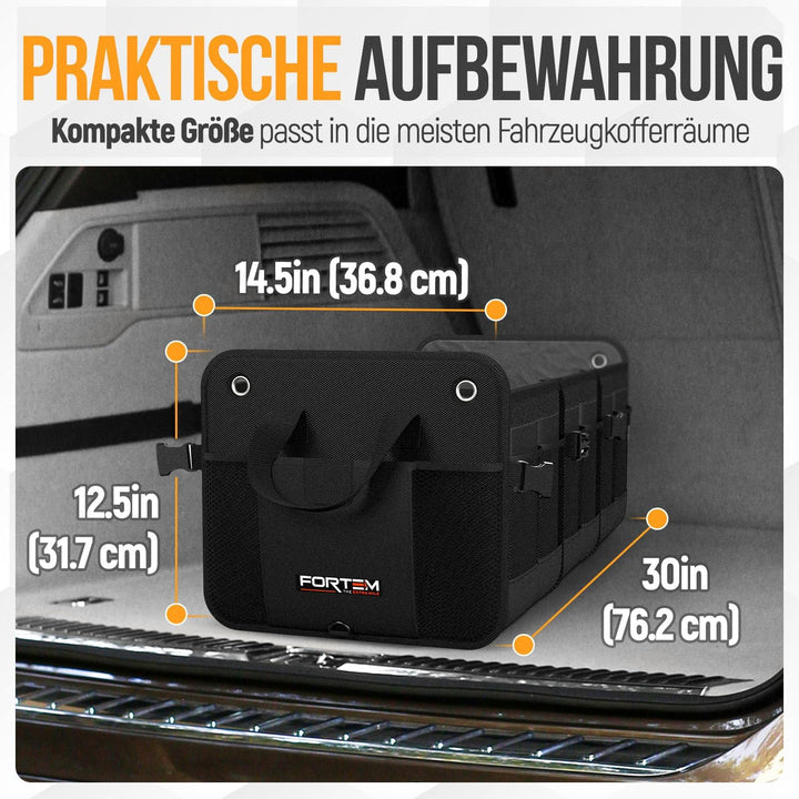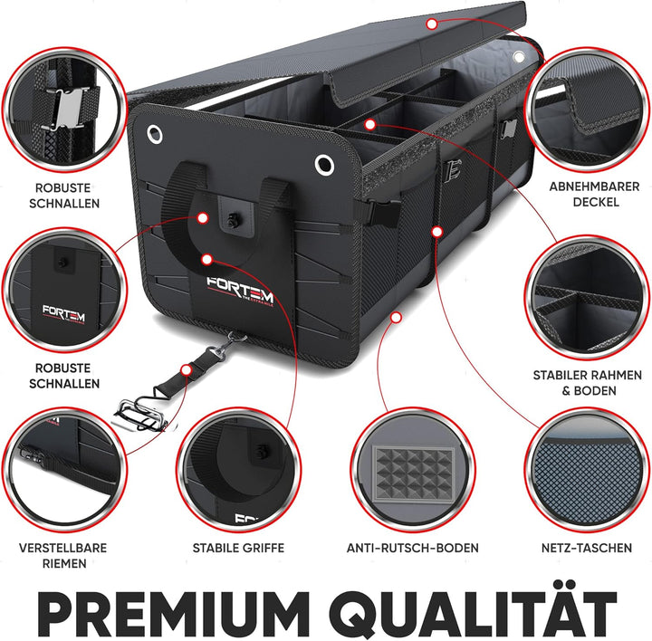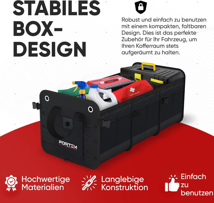 • Robustes Boxendesign - Der Premium Auto Kofferraum Organizer von Fortem ist mit stabilen Bodenplatten ver-stärkt, sodass jede Seitenwand gestützt wird. Unsere Kofferraum Tasche ist die beste unter den Auto Organizer Lösungen und Aufbewahrungsboxen mit
