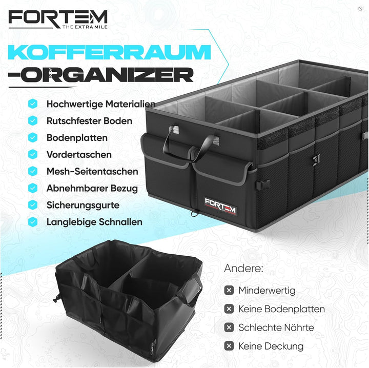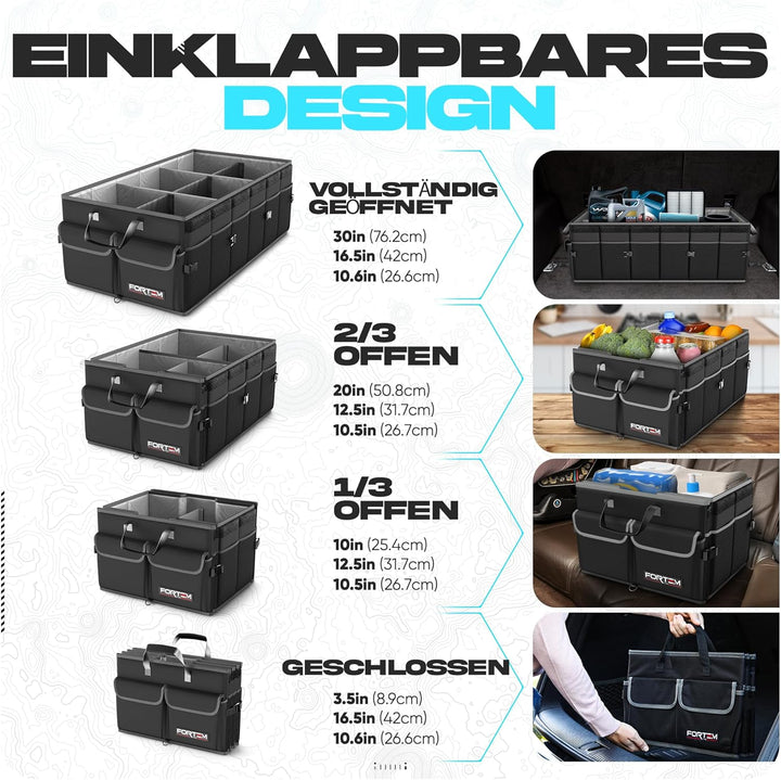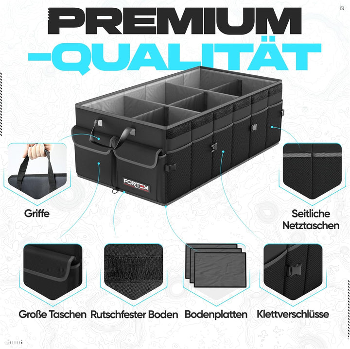• ·       Robustes Boxendesign - Der Premium Auto Kofferraum Organizer von Fortem ist mit stabilen Bodenplatten verstärkt, sodass jede Seitenwand gestützt wird. Unsere Kofferraum Tasche ist die beste unter den Auto Organizer Lösungen und