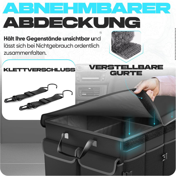 • ·       Zusammenklappbare Autotasche Kofferraumtasche mit abnehmbarem Deckel - Sie können die Kofferraumtasche auch als Rücksitz- oder Beifahrersitz Organizer verwenden sowie ihn in der Mitte Ihres Fahrzeugs platzieren, da sie auf 1 Fach