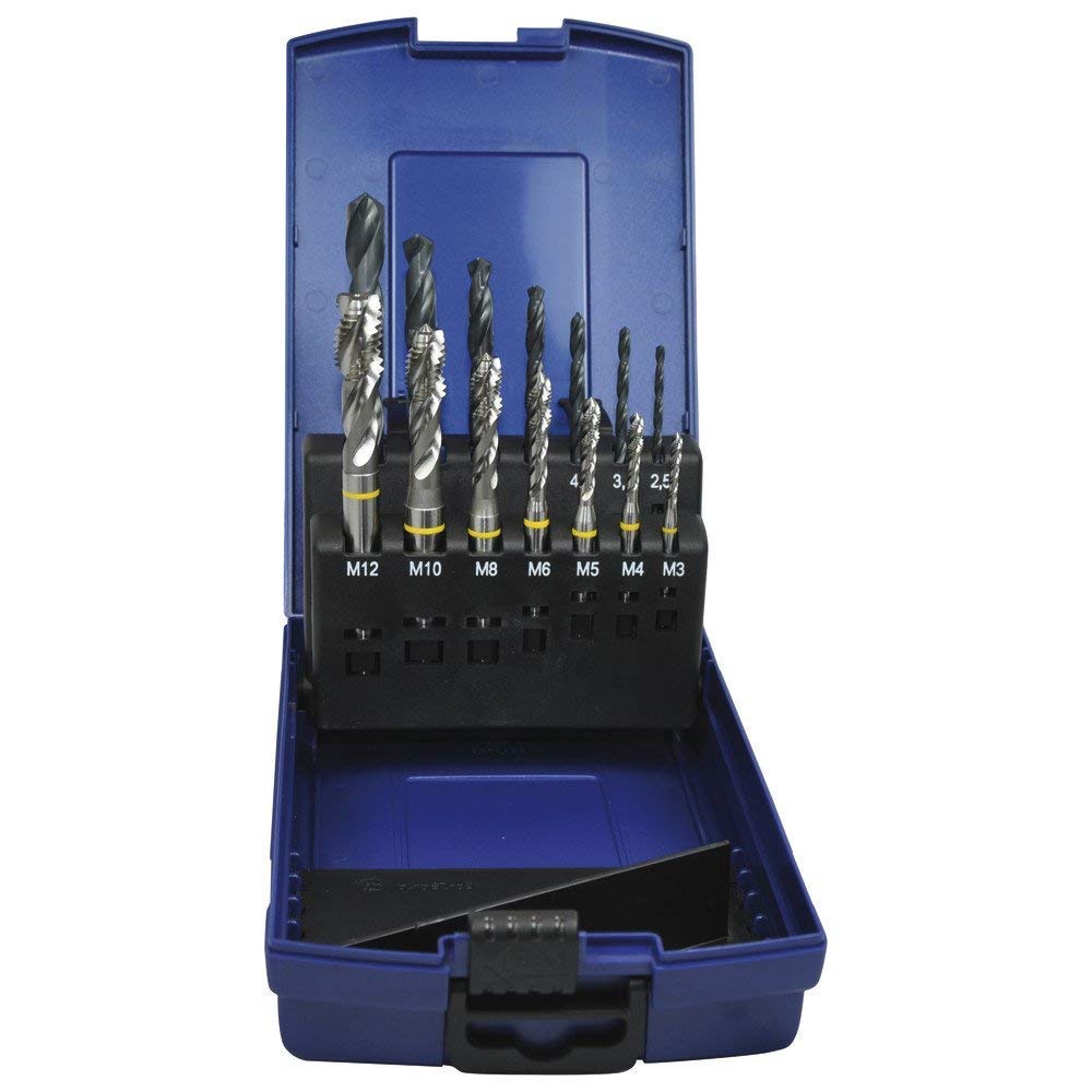 PRODUKTBESCHREIBUNGEN Sackloch-Maschinengewindebohrer-Satz mit Spiralbohrer, blank - Metrisches ISO-Gewinde DIN 13 - Form C (2-3 Gang) - Rechtsspirale 40° - Toleranz ISO 2 6H - Gewindebohrer nach DIN 371 (M3-M10) mit verstärktem Schaft bzw. DIN 376 mit Überlaufschaft - 2 x D Sackloch Lieferung: In Kunststoffkassette. 7 Gewindebohrer M3, 4, 5, 6, 8, 10, 12 und 7 Spiralbohrer-Durchm. Ø 2,5, 3,3, 4,2, 5,0, 6,8, 8,5, 10,2 Technische Daten: Stahl