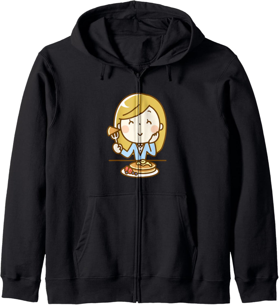 Frau geniesst Pfannkuchen Kapuzenjacke