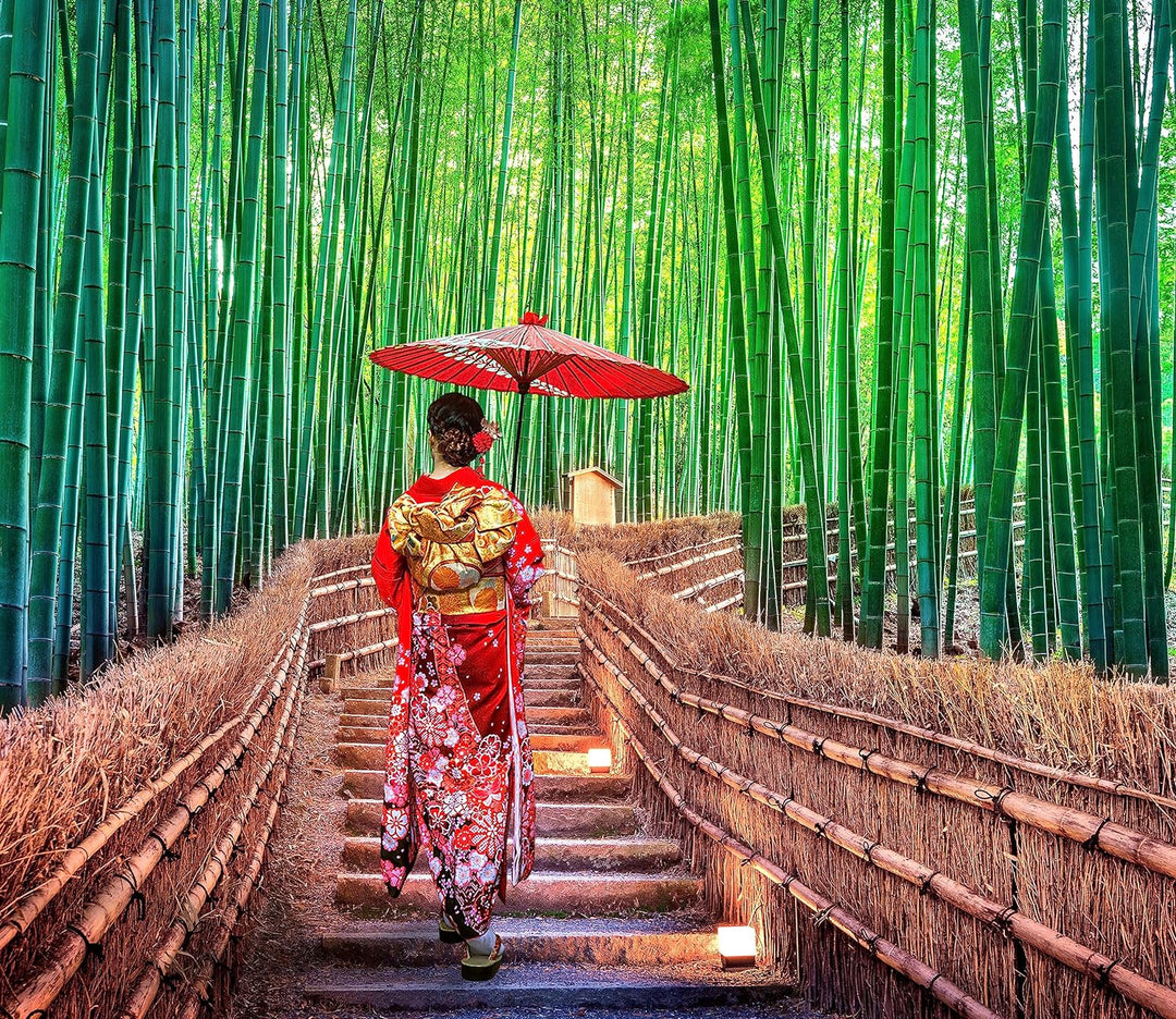 Frau im janapischen Kimono im Bambuswald Herdabdeckplatte & Spritzschutz aus Echtglas | Für Herd-Koc
