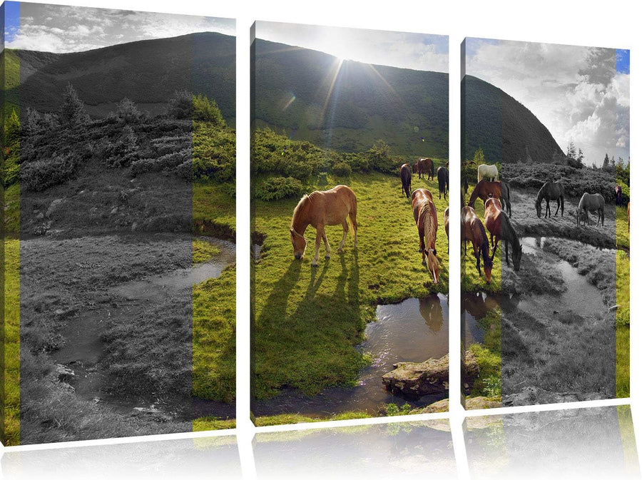 fressende Pferdeherde im Gebirge schwarz/weiss 3-Teiler Leinwandbild 120x80 Bild auf Leinwand, XXL r