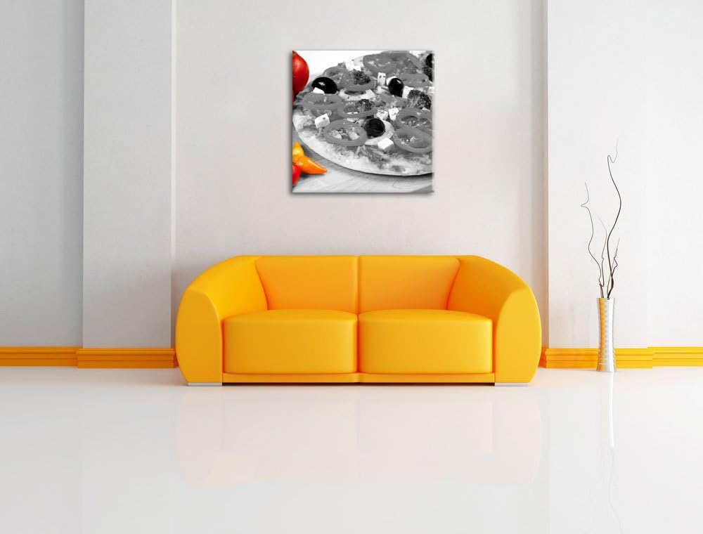 Frische Pizza mit Oliven,Format: 70x70 als Leinwandbild, tolle Bilder fertig auf Holzrahmen gespannt