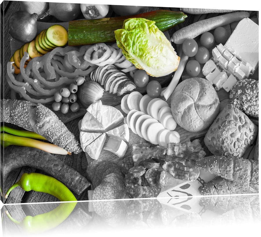Früstücksplatte mit Gemüse schwarz/weiss Format: 100x70 auf Leinwand, XXL riesige Bilder fertig gera