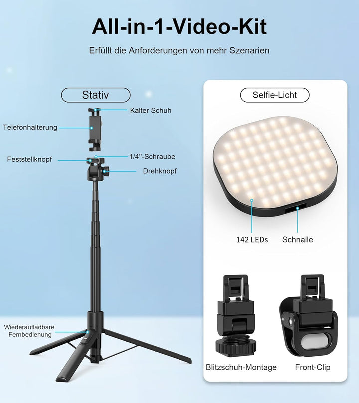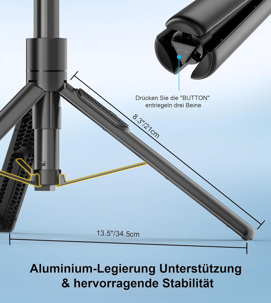 - 3-in-1 Selfie Stick Stativ Handy Mit Licth für Telefon & Kamera : Der Telefonstativständer mit One Button Unlock Design, Sie brauchen nur einen Finger zu drücken "Button" und dann frei wechseln von Einbeinstativ zu Selfie Stick zu Stativ-Modus, Stativ