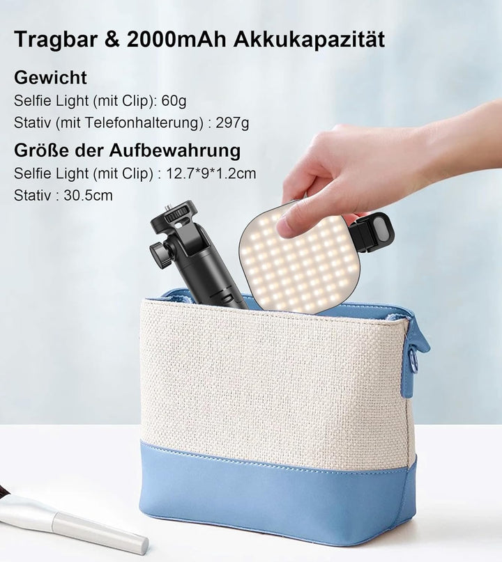 - Kompakt & Handlich : Tragbarer selfie-stick max Höhe zu 153cm und die gefaltete Grösse ist 30cm mit Gewicht 297g; LED-Licht wiegt 60g. Gewicht 297g; LED-Selfie-Licht wiegt 60g. Es kann leicht in die Tasche oder den Rucksack gesteckt werden und nimmt