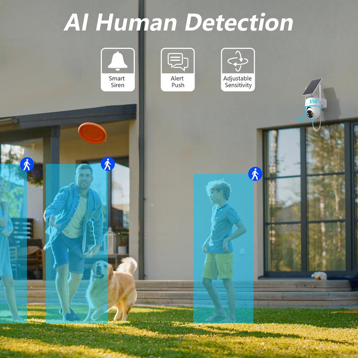 • 【2K Auflösung und Neigen/Schwenken/Zoom】 Mit 2K-Auflösung kann diese Akku Überwachungskamera Aussen Tag und Nacht klarere Bilder als 1080P liefern. Die Akku-Aussenkamera unterstützt eine 350°-Schwenkdrehung, eine 90°-Neigungsdrehung und einen